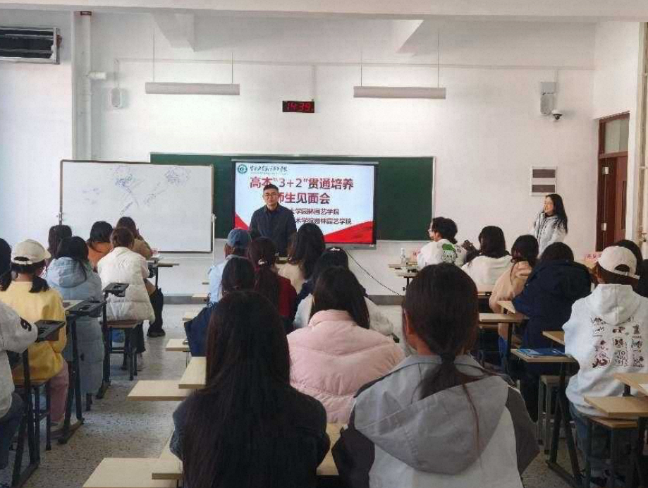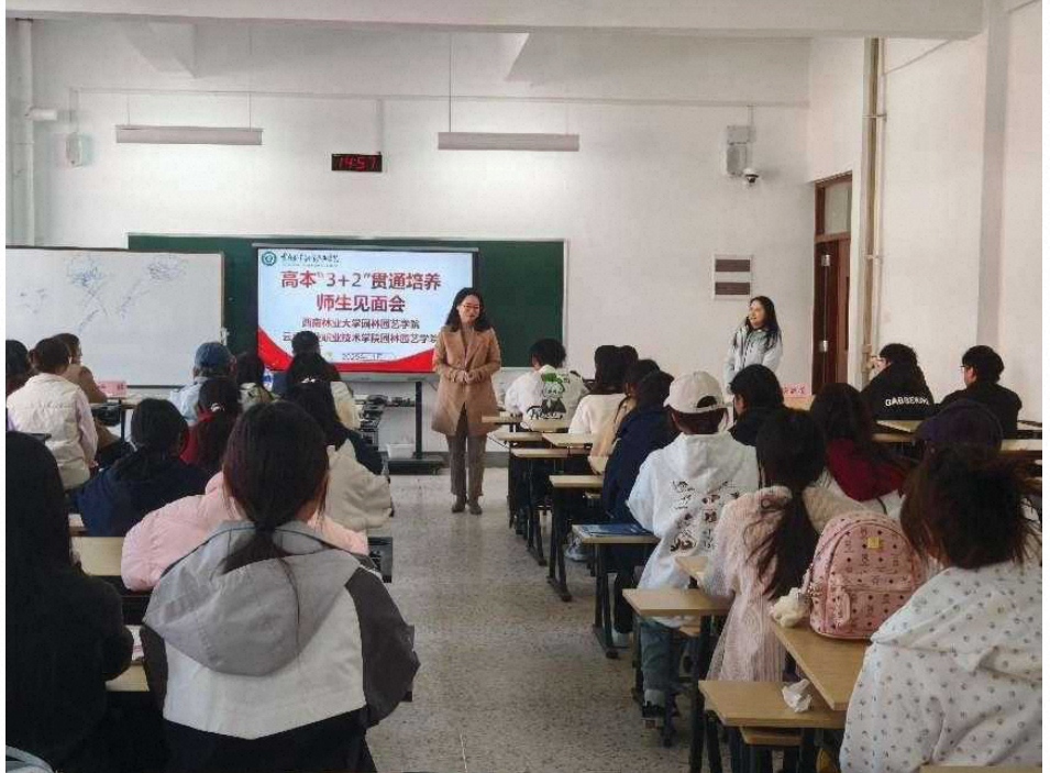 签约仪式后,刘刚连、刘嘉纬、杨楠与云南林业职业技术学院高本“3+2”贯通培养园林专业学生举行了见面会。会上,刘刚连对同学们的成长发展表示关切,结合园林园艺行业发展前景及西南林业大学的办学特色,鼓励同学们树立远大理想,做新时代的园林好青年。刘嘉纬介绍了学院整体概况,分享了专业学习方法和科研实践技巧,引导同学们培养专业兴趣,提升专业素养。杨楠从专业培养方案、课程体系衔接、升学就业指导等方面为同学们进行了详细讲解,解答了同学们关于后续学习阶段的疑问。同学们纷纷表示,通过见面会进一步明确了学习目标,对未来的学习生活充满信心。