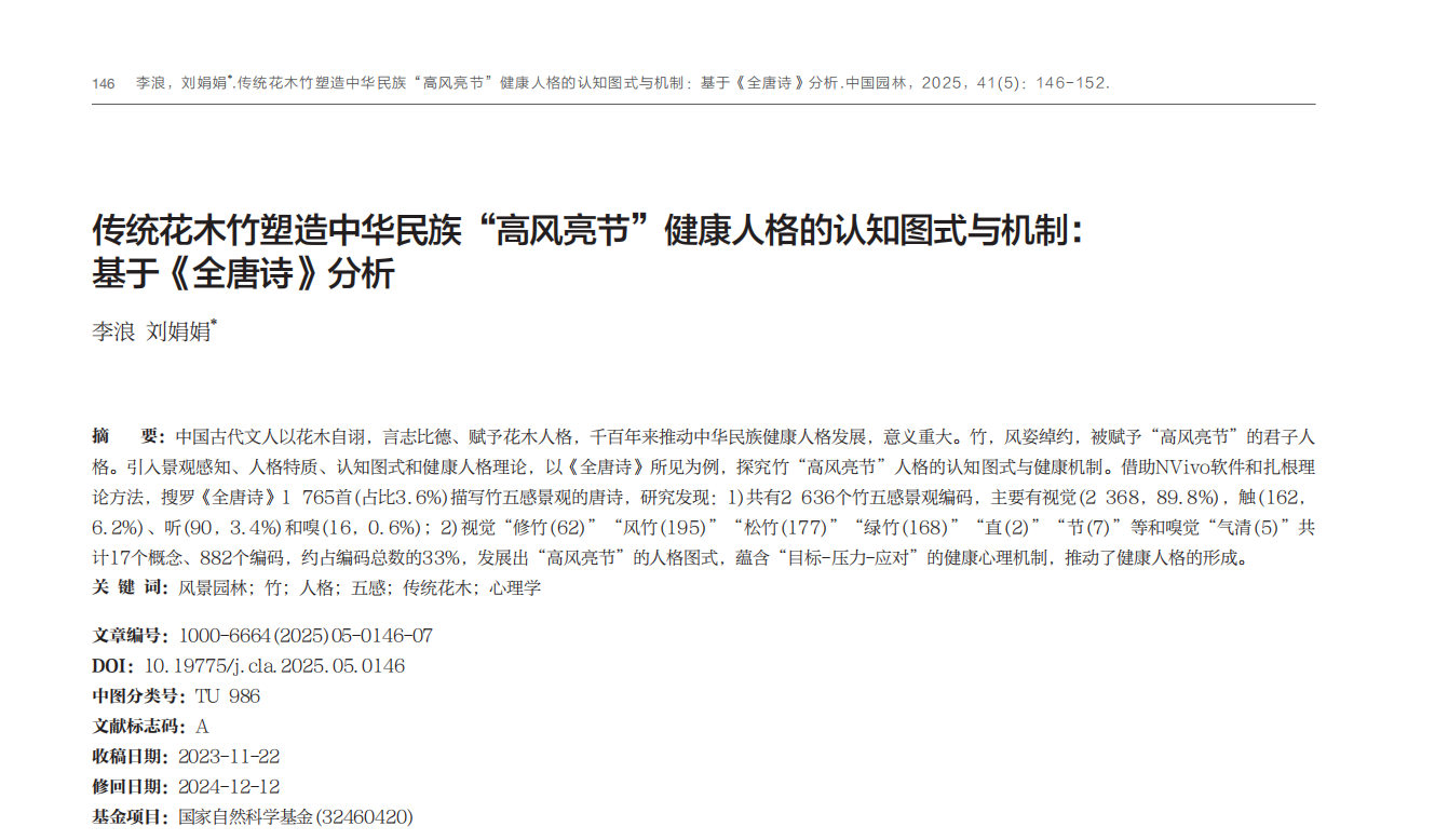 我院风景园林系刘娟娟教授数字化风景园林康养团队于《中国园林》2025年第5期发表研究论文《传统花木竹塑造中华民族“高风亮节”健康人格的认知图式与机制:基于<全唐诗>分析》。该论文创新性地运用健康人格理论,深入研究中国传统园林花木独具特色的康养模式。这项研究为刘娟娟教授提出并首创的“风景园林心理学”方向增添了新的突破。我院2021级风景园林学硕士研究生李浪为第一作者,刘娟娟教授为通讯作者,研究得到了国家自然科学基金《耦合地理空间和历史文本数据的云南边疆名山风景区景观“特征—感知—偏好—认同”研究(32460420)》资助。《中国园林》是风景园林学科的权威期刊,为中文核心期刊、中国科技核心期刊、RCCSE中国核心学术期刊、建筑科学领域高质量科技期刊分级目录(2020年)T1级期刊、中国农林核心期刊、中国科学引文数据库(CSCD)来源期刊和中国人文社会科学来源期刊。