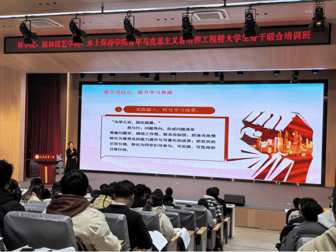 1月6日,林学院、园林园艺学院、水土保持学院青年马克思主义者培养工程暨大学生骨干联合培训班在图书馆大报告厅开班。三家学院党委副书记、团委书记、学生组织负责人以及288名青马学员参加开班仪式。