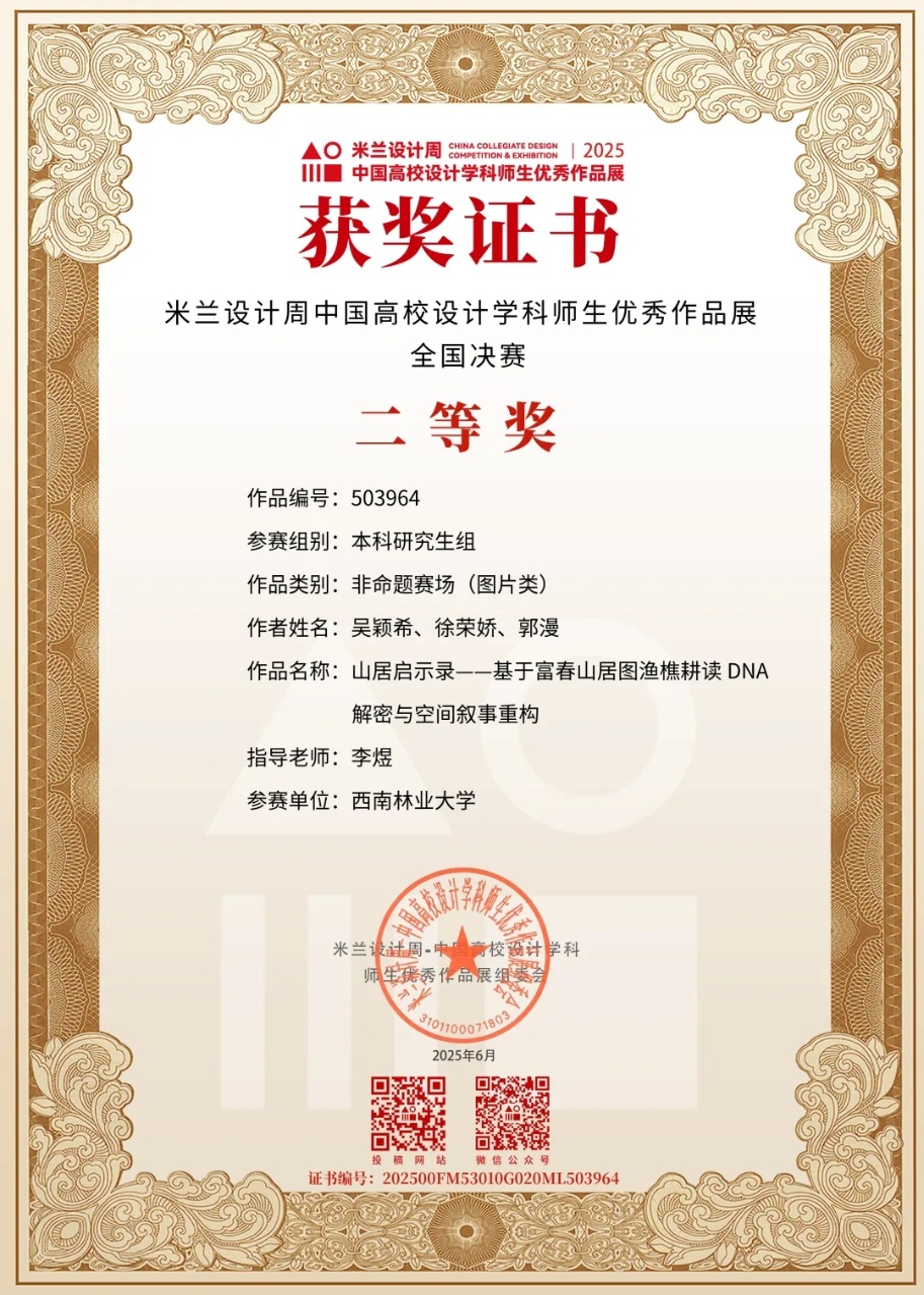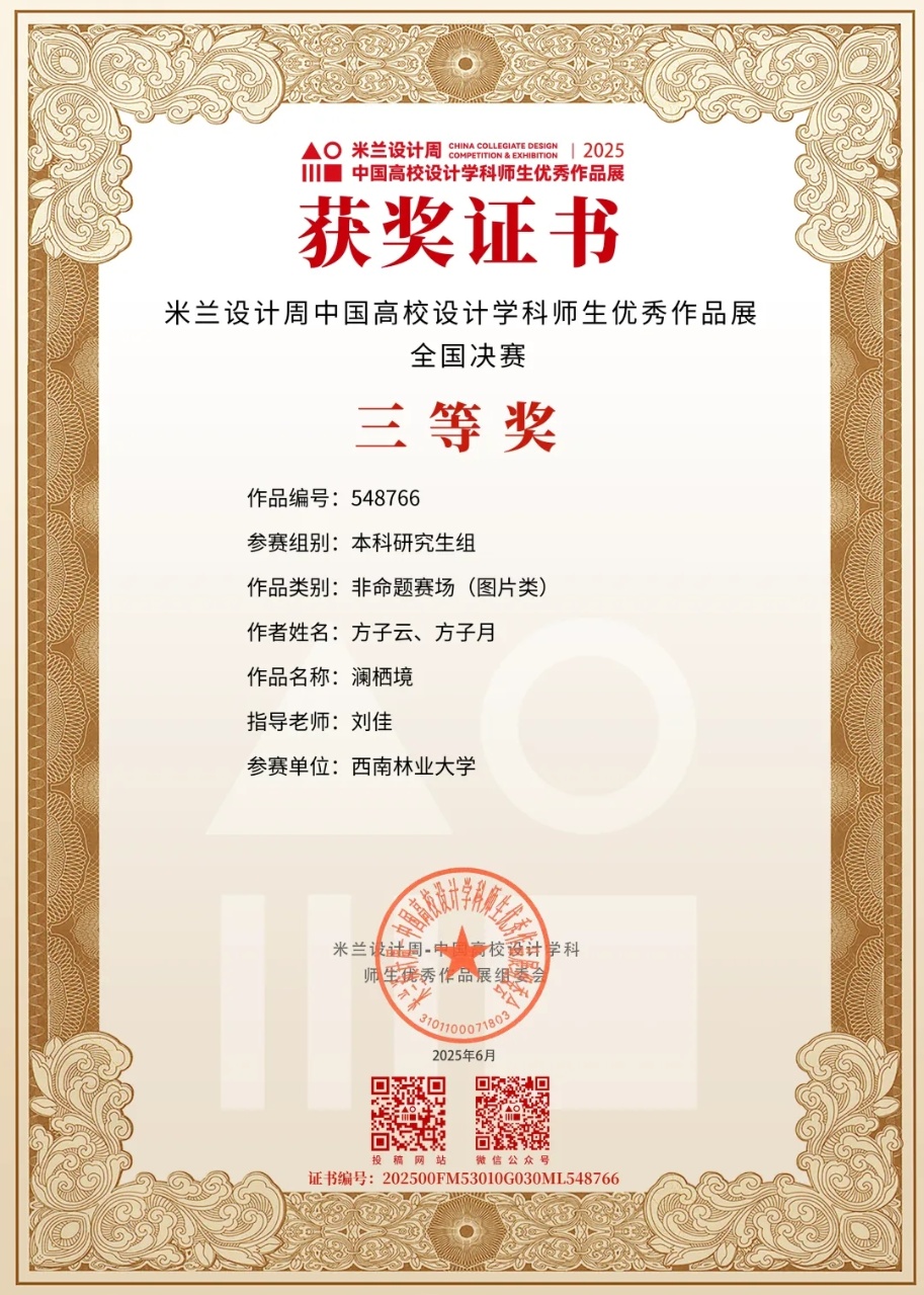 刚刚落幕的2025年米兰设计周——中国高校设计学科师生优秀作品展,西南林业大学园林园艺学院学子凭借出色的专业素养和创新能力,荣获国家级一等奖1项、二等奖1项、三等奖1项,并在云南赛区斩获一等奖1项、二等奖3项,成果丰硕,表现亮眼!