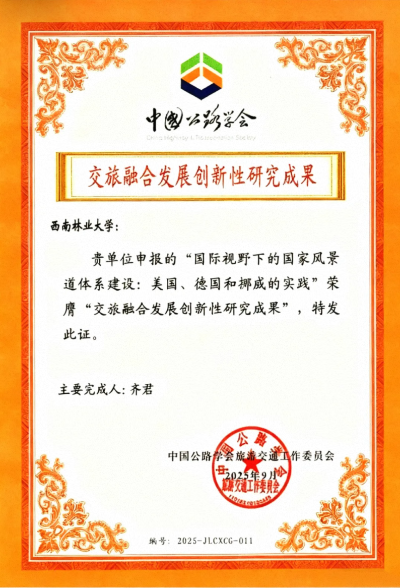 近日,第八届旅游交通大会在湖北宜昌隆重举行。大会公布了备受瞩目的交旅融合发展创新性研究成果评选结果,全国共有15项优秀成果获此殊荣。由我校园林园艺学院齐君副教授主持完成的学术论文《国际视野下的国家风景道体系建设:美国、德国和挪威的实践》成功入选,彰显了我校在相关领域的学术影响力。